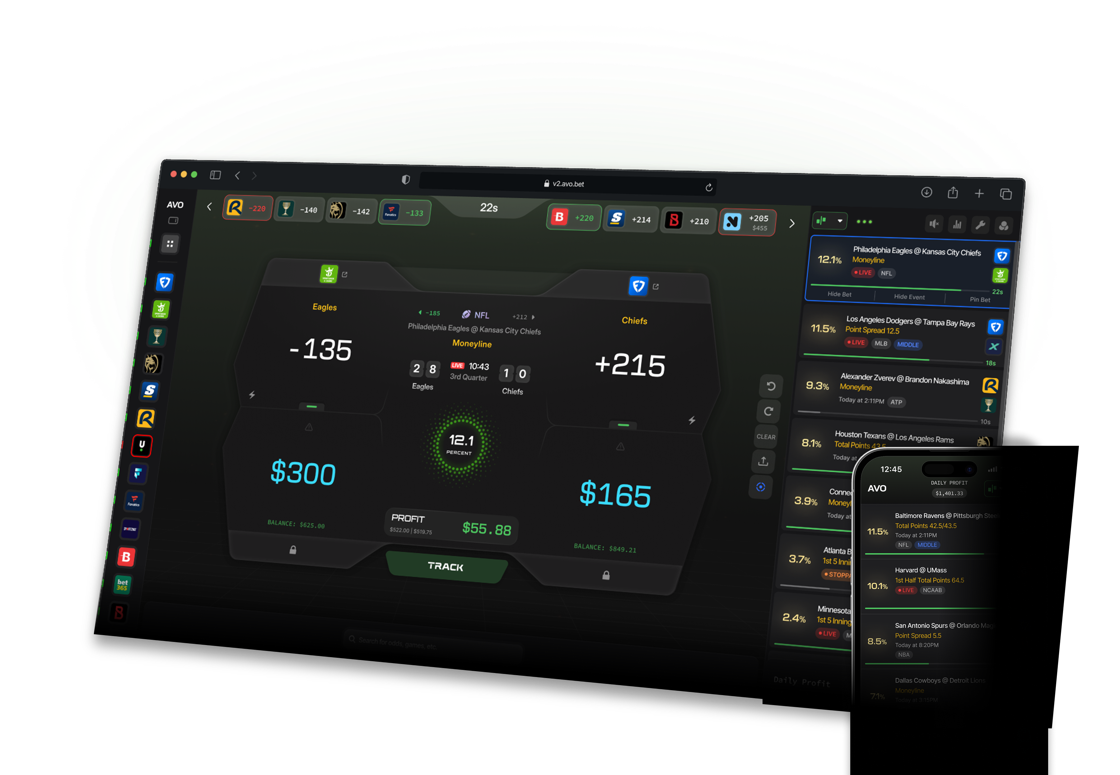 AVO scans odds from tons of sportsbooks and finds opportunities where the numbers are in your favor. Sometimes that means an arbitrage bet—where you lock in profit no matter who wins. Other times, it’s a positive EV bet, a middle, or a promo play—bets that give you an edge over the long run. Everything shows up in one clean dashboard, so you can focus on placing smart bets, not crunching numbers.